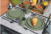 Dette industrielle Patom servisesettet har et robust utseende. Det grønne serviset har et solid utseende med hevet kant. Foruten det vakre designet er serviset veldig lett og solid. Bestikket er godt å bruke på campingplassen, da det er tilnærmet uknuselig, bruddsikkert og ripebestandig. Serveringsserviset kan også brukes perfekt hjemme. Settet på 16 deler er laget av høykvalitets 100 % melamin og tåler oppvaskmaskin og matgodkjent. Dette stilige settet passer for 4 personer og inkluderer 4 middagstallerkener, 4 frokosttallerkener, 4 boller og 4 krus.