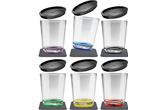 Dette settet består av seks flotte plastglass med ulike farger på bunn og tilhørende brikker og lokk.